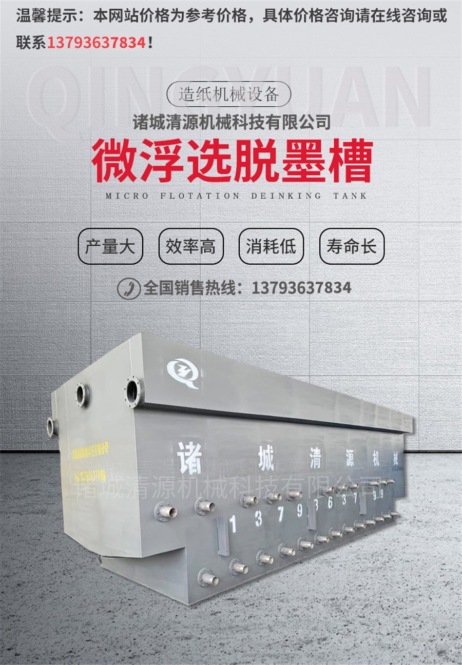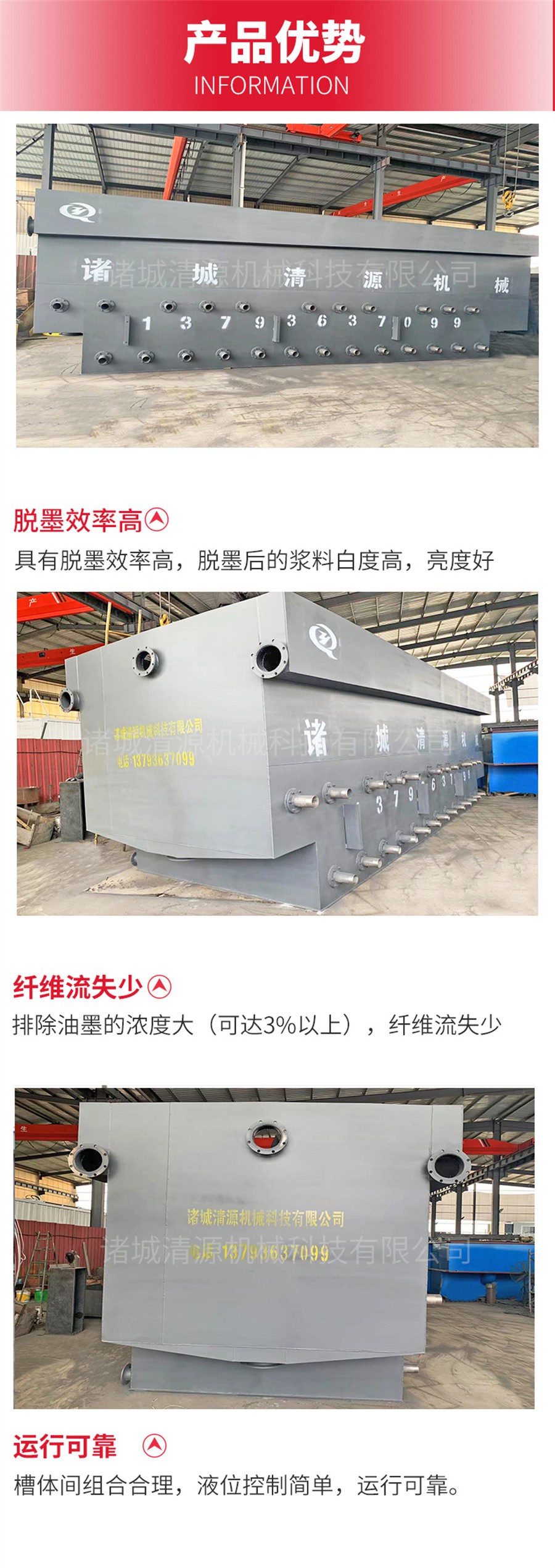 脫墨槽內通過特殊結構的級間分離裝置,形成層次分明的多級浮選,防止了不同浮選級間漿料的混合,而空氣的分散及于漿料的混合,是靠特殊開發的無堵塞射流系統來完成的,這種獨特的裝置結構使紙漿進行內部循環,空氣在紙漿內被多次利用,大大提高空氣的利用率和油墨脫除效率。脫墨槽具有脫墨效率高,脫墨后的漿料白度高,亮度好,排除油墨的濃度大(可達3%以上),纖維流失極少,占地面積小,操作控制簡單,能耗低等顯著優點。