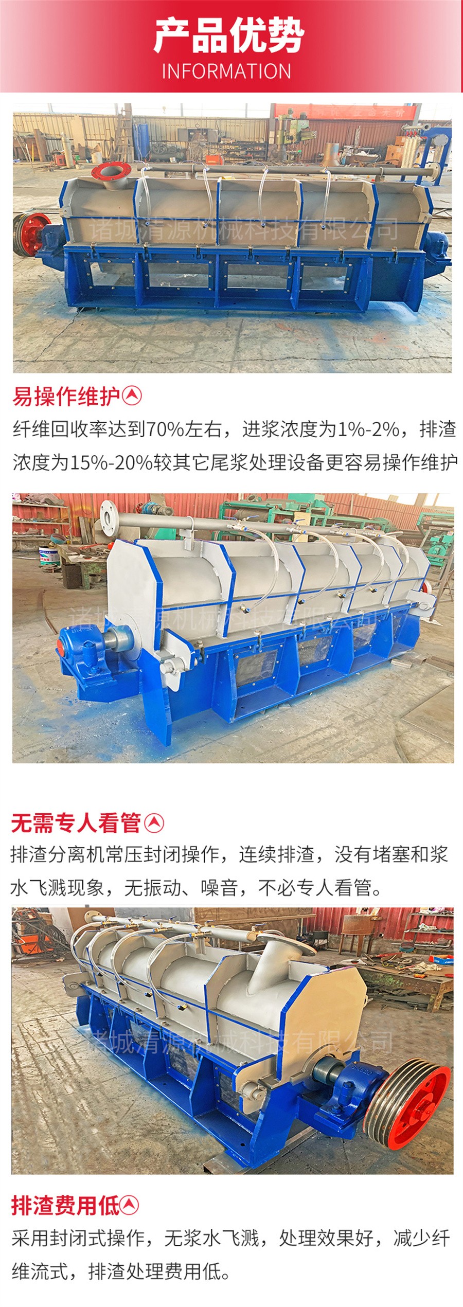 諸城清源機械生產的紙塑分離機轉子是帶葉片的長圓柱體結構,葉片靠近設備主體,轉子上葉片的角度是預設定的,為更優化的角度。軸的設計可使傳動皮帶安裝在設備兩端中的任一端。由位于殼體兩側的兩端軸承座支撐轉子。殼體蓋子易于拆卸,易于檢修內部元件,進口管和皮帶輪不需拆下即可檢修轉子或篩板。蓋子上設有防止漿料軸向回流的擋板,由轉子推動漿料向前運動。良漿出口槽和排渣槽都是總體結構的一部分,良漿槽是用來收集濾液的,它的設計增加了設備強度。排渣槽位于進口末端對面的支腿上。帶孔的篩板是半圓柱形的,篩板上的通孔可因使用條件的不同而不同。篩板用螺栓固定在殼體上。